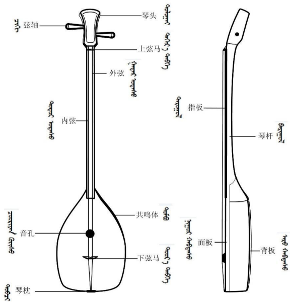 内弦与外弦采用纯四度音程关系(如A、d和G、c等),或可按演奏要求两弦采用纯五度定弦演奏形式。